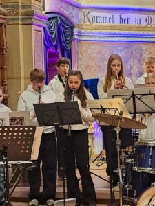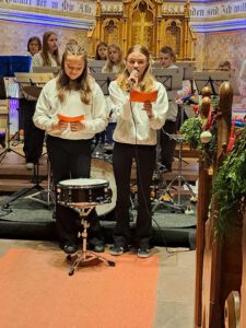 Den Auftakt übernahmen die Königskinder und setzten mit Stücken wie Little Drummer Boy, Let it Go und Sleigh Ride stimmungsvolle, winterlich geprägte Akzente. Der warme Klang des Orchesters füllte den Kirchenraum und schuf von Beginn an eine Atmosphäre zwischen Vorfreude und Besinnlichkeit. Durch diesen ersten Teil des Abends führten die Schülerinnen Alina Reinhardt und Emma Höppner mit viel Herz, Ruhe und Professionalität. In ihren Worten schwang nicht nur Stolz auf die jungen Musikerinnen und Musiker mit, sondern auch ein ehrlicher Dank an die musikalische Leitung: Sylvia König und Susanne Schreiber, deren Geduld und kontinuierliche Arbeit den Schülerinnen und Schülern deutlich anzumerken waren.