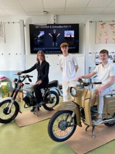 Für die Klasse 9b der Anne-Frank-Schule in Wanfried standen in dieser Woche die Projektprüfungen an. Die Schülerinnen und Schüler haben gezeigt, wie viel Kompetenz, Engagement und Verantwortungsbewusstsein in ihnen steckt. Im Klassenzimmer sorgte besonders die Gruppe mit Linus, Tom und Emma für Aufsehen: Für ihr Thema zur Zweiradmechanik brachten sie eine Simson S51 und eine Schwalbe KR51 mit in die Klasse. Das war kein Showeffekt, sondern ein klug gewähltes Praxiselement, das ihre Inhalte greifbar machte und deutlich zeigte, wie ernst sie ihre Prüfung nehmen.