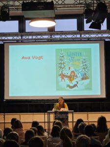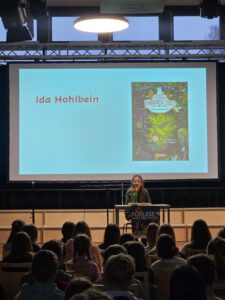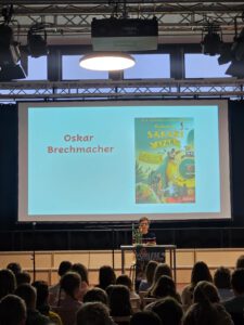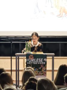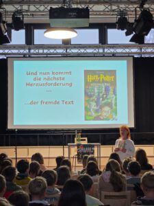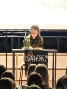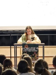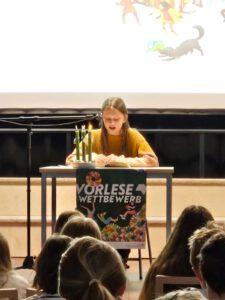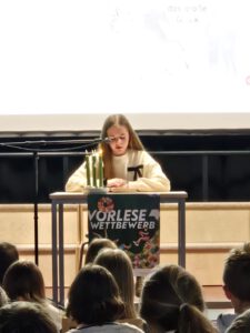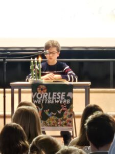 Die erste Runde begann mit den selbst ausgewählten Texten der Klassensiegerinnen und Klassensieger. Die Lesebeiträge wurden von einer sorgsam zusammengestellten digitalen Präsentation begleitet, die die vorgestellten Bücher sichtbar machte und den Ablauf elegant strukturierte. Anschließend folgte die zweite Runde mit dem unbekannten Text; in diesem Jahr ein Auszug aus der Harry-Potter-Reihe. Hier zeigte sich, welche Vorleserinnen und Vorleser spontan, präzise und mit echtem Gefühl lesen können.