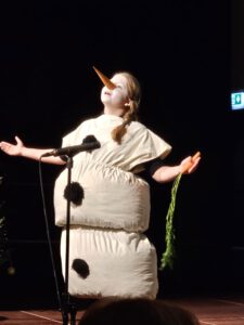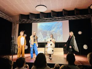 Dieses Mal bot die Theatergruppe unter der Leitung Stefanie Pelkas und Heike Gress‘ eine Adaption der „Eiskönigin“. Die böse Schneekönigin veränderte mit ihrem frostigen Blick Prinzessin Elsas (Lucia Ruppel) Charakter, sodass deren Herz kalt wurde. Wanfriedania, der Handlungsort, wurde dadurch von Winter und Eiseskälte eingenommen. Die Beherztheit Annas (Ava Vogt) und die Liebe zu Elsa, ihrer Schwester, sorgten schließlich für die Rettung Elsas und Wanfriedanias. Schneemann Olaf, herausragend und brillant dargestellt von Daria Kaucher, führte durch die Geschichte und erzählte dem Publikum die Zwischendurch-Ereignisse.